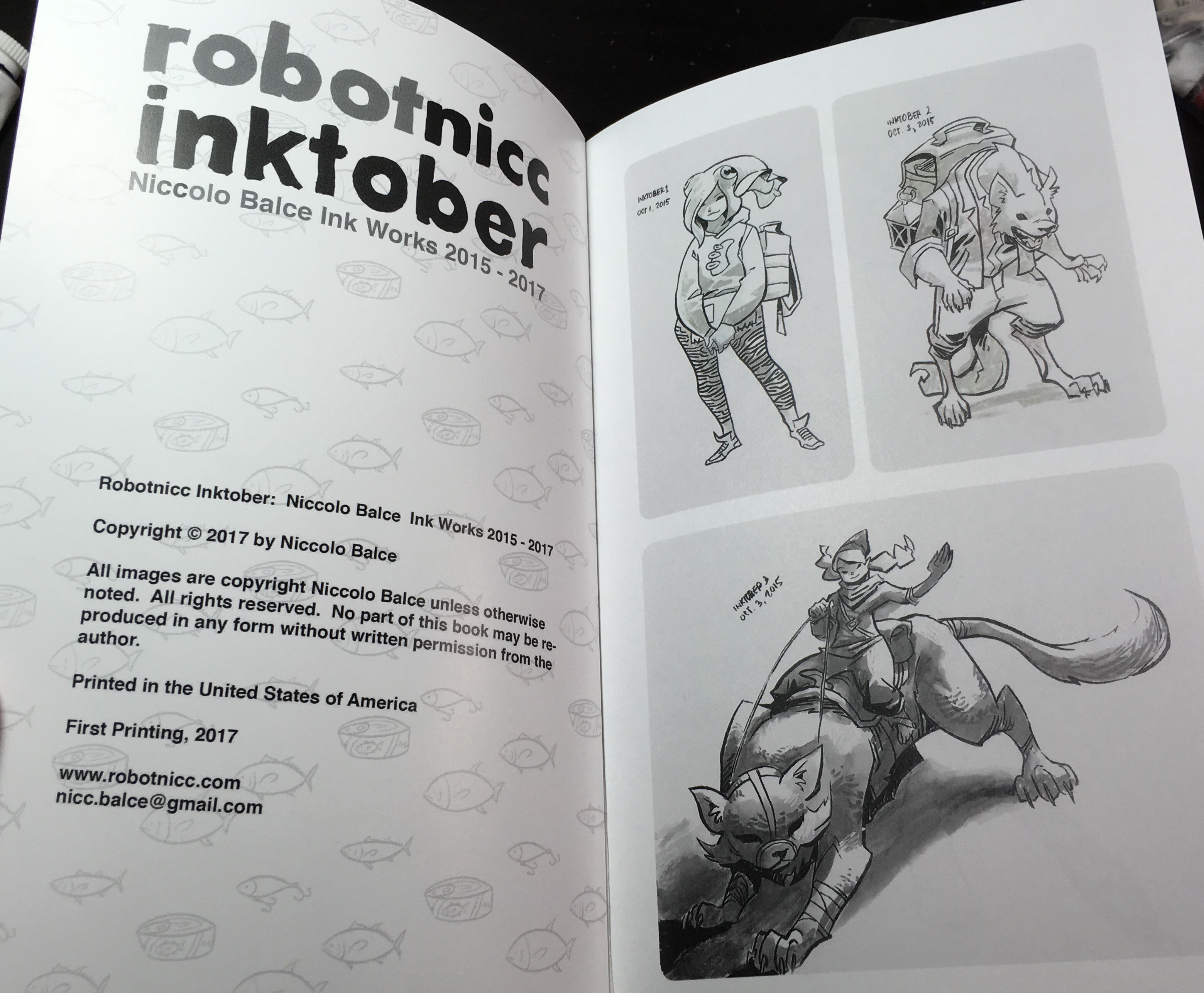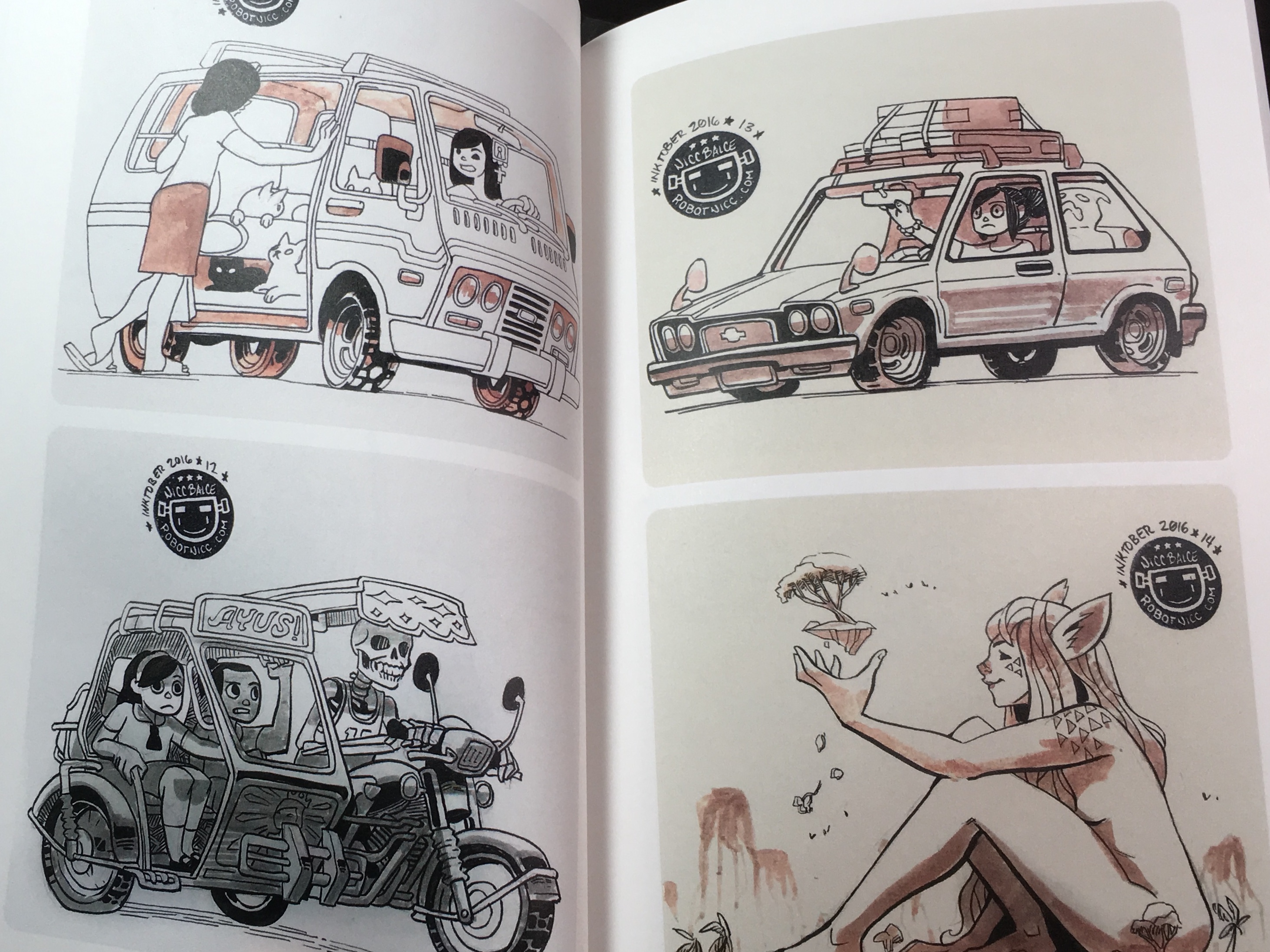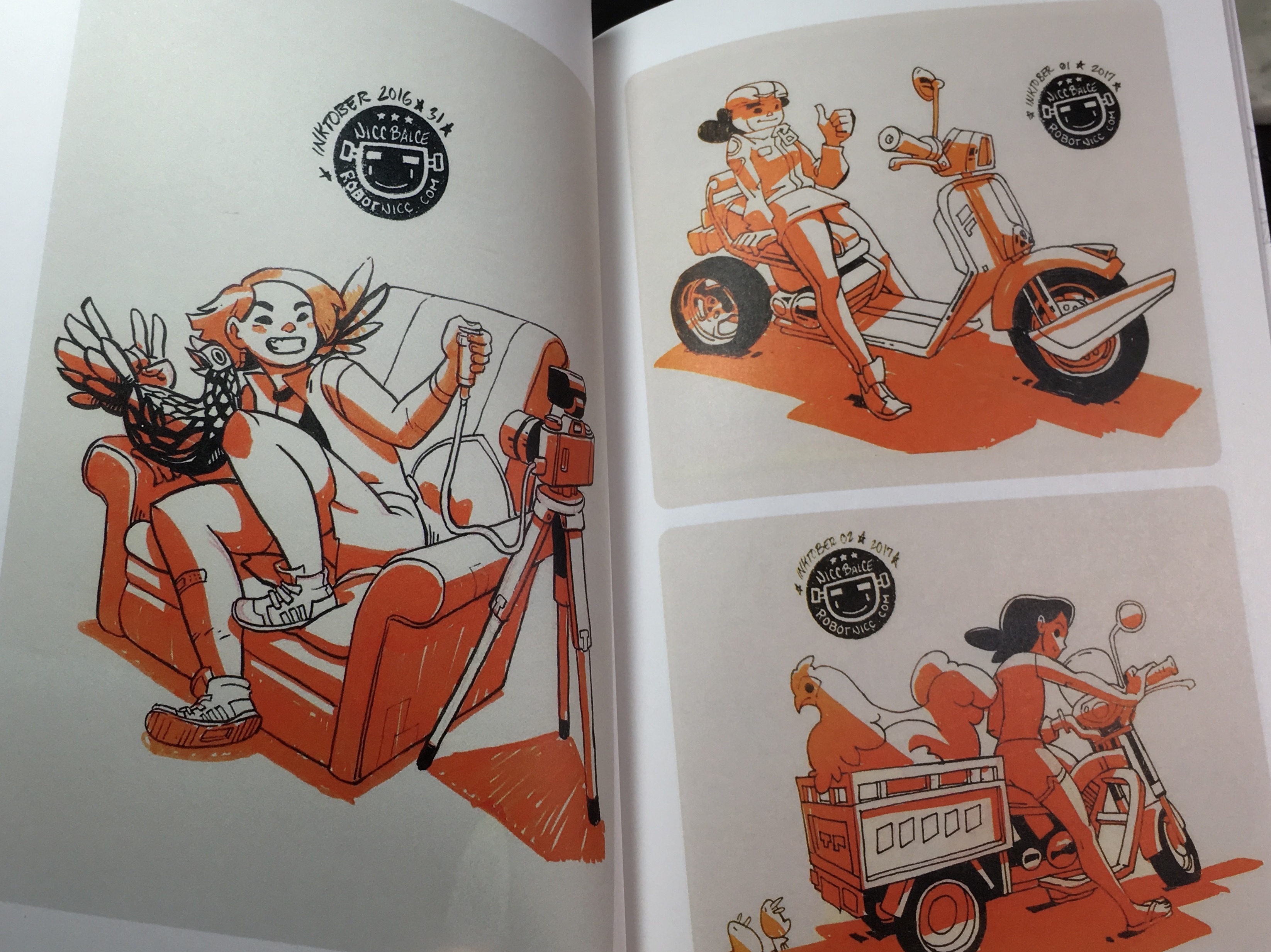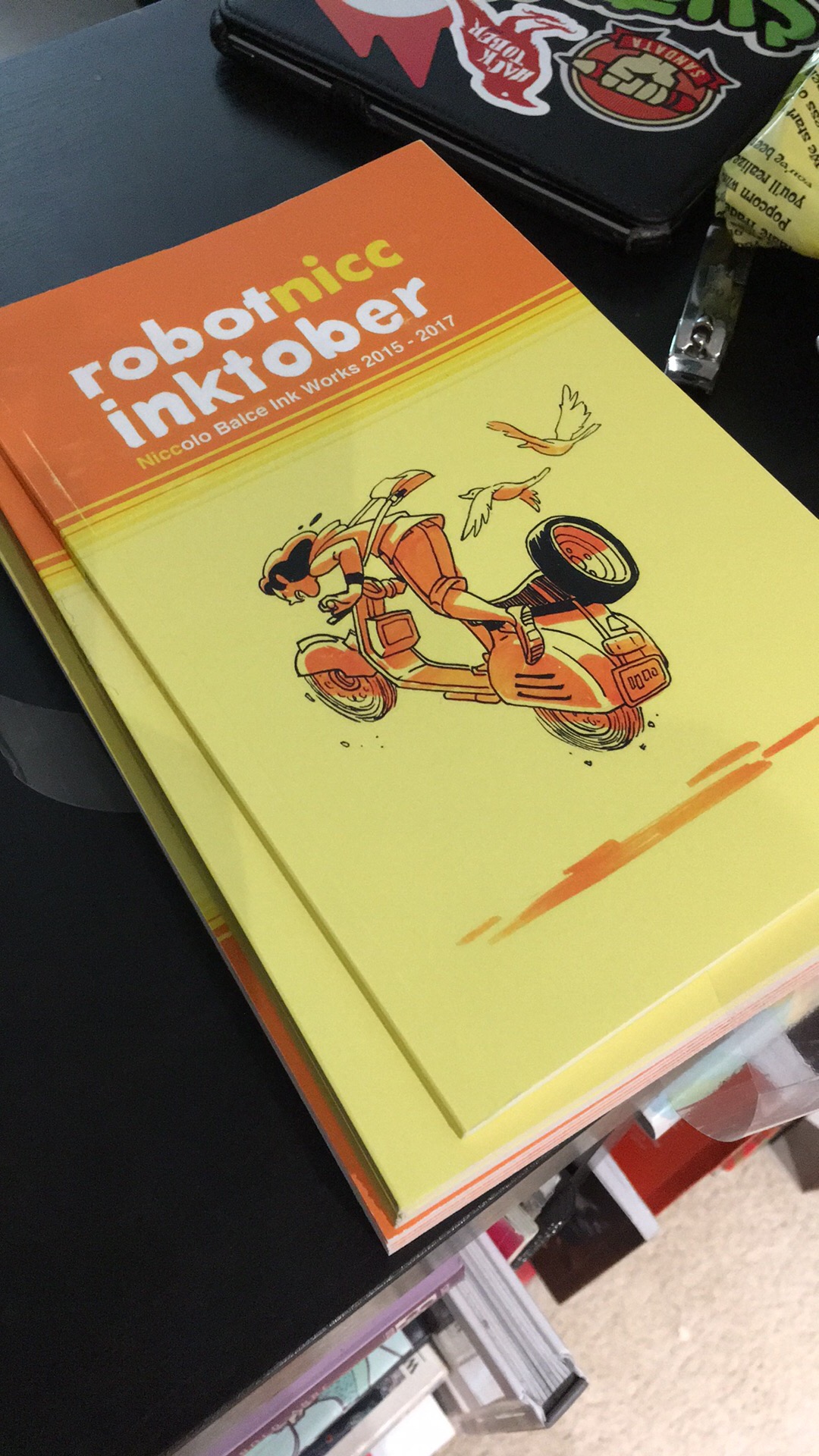 -60 pages -Signed by me at the interior back cover! :) -8.5" x 5.5" -Softcover, perfect bound -Complete collection of my Inktobers 2015 to 2017 -Includes some mopeds and car drawings! -Includes some pages of sketches!